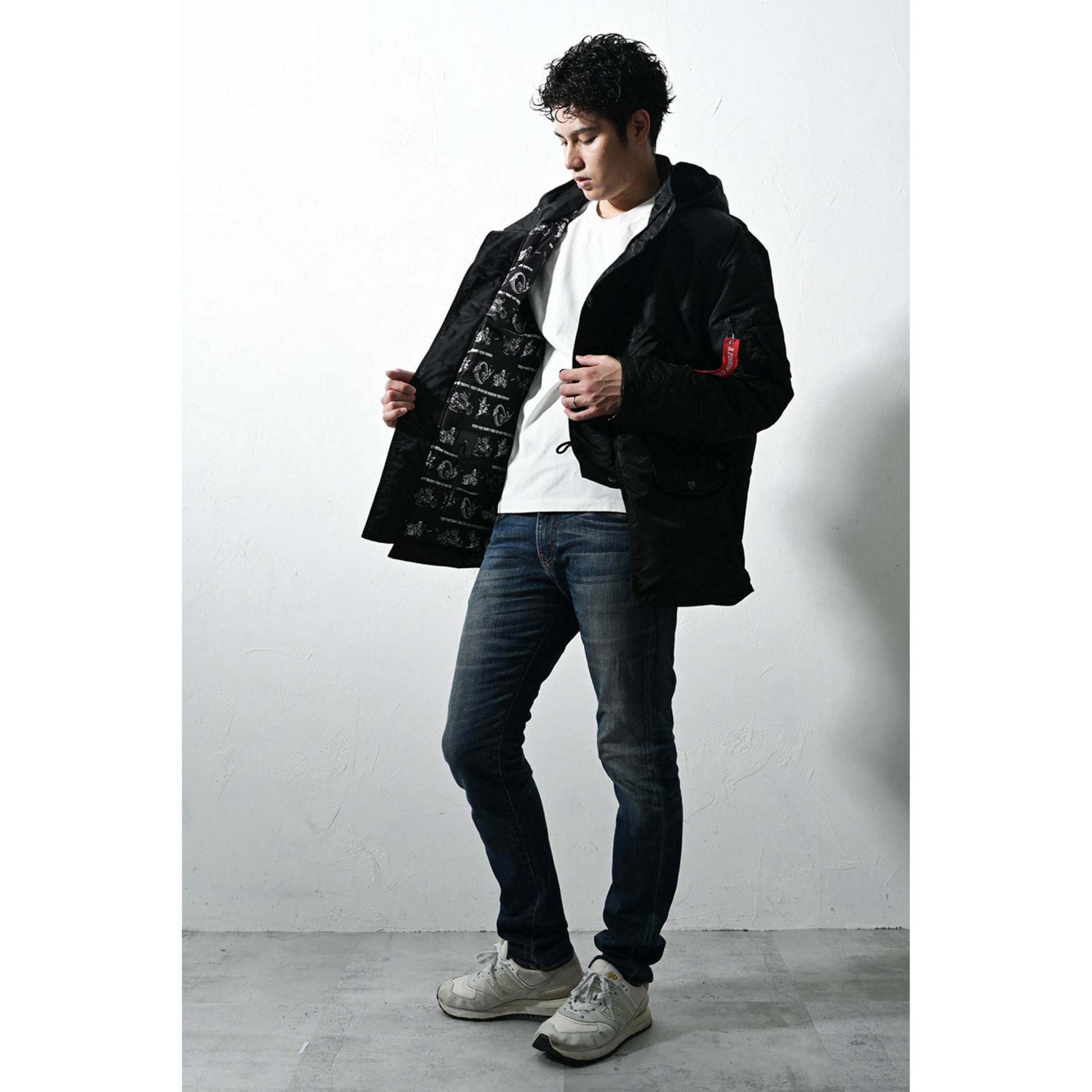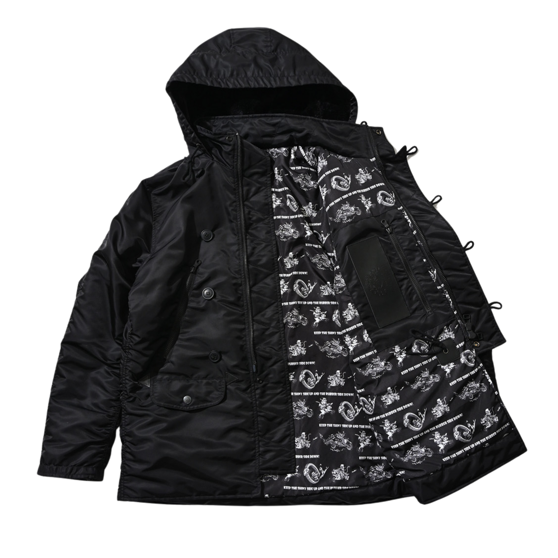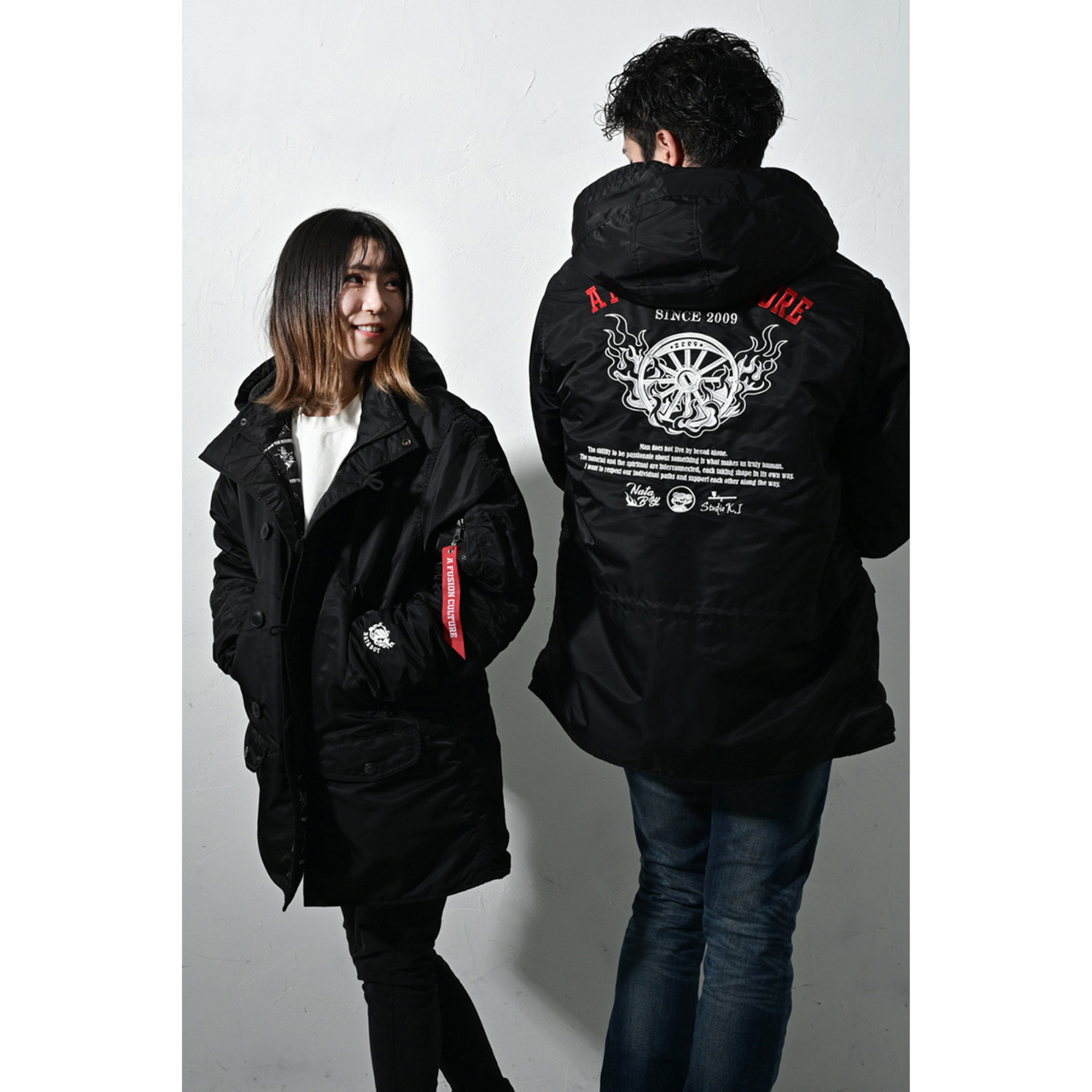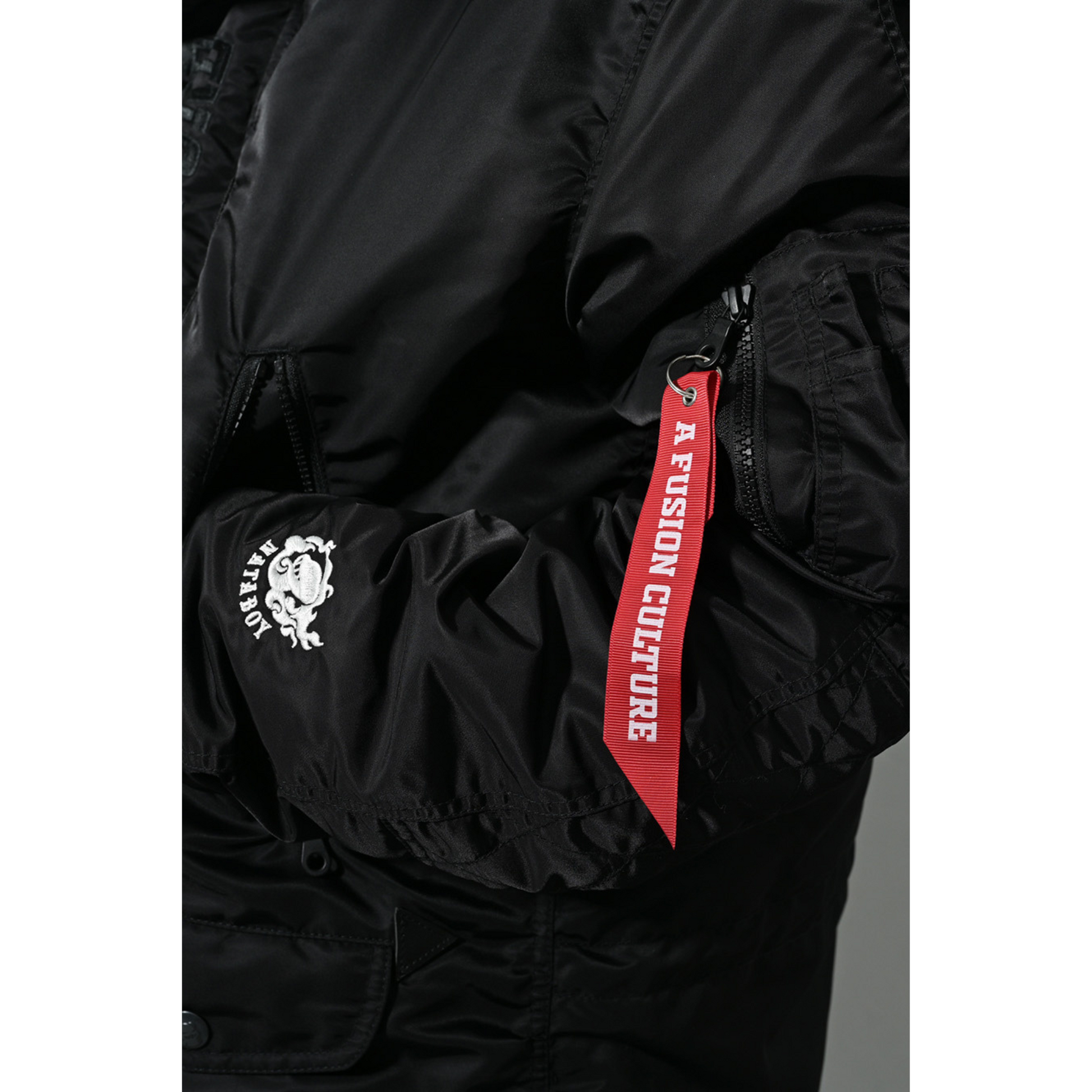 フライトジャケットではMA-1が有名ですが、それの派生型として更に防寒性の高い仕様としての特徴があります。着丈に長さがあるのでインナーの種類を選ばず、サッと羽織れるダウンジャケットのような取り回しなので、タウンユースを優先してオリジナルにアレンジを致しました。デザインとしてはいつものプリントではなく刺繍で全てを贅沢に描いております。細部にわたってこだわりを詰め込んで贅沢に作りました。完全な限定生産になりますが、冬のカジュアルアウターとしてブランドのスタイリング提案になります
